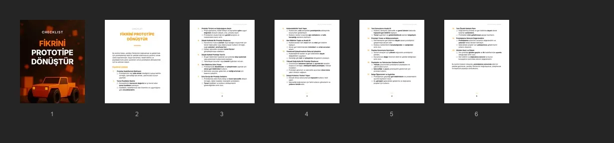 Müşterilerinizin fikirlerini test etmek ve geliştirmek için prototipleri kullanmalarına rehberlik edecek, geri bildirim toplamalarına ve ürünlerini tam geliştirmeden önce iyileştirmelerine yardımcı olacak kontrol listesi.