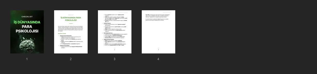 Müşterilerinize iş hayatında para psikolojisinde ustalaşmaları için net ve yapılandırılmış bir rehber sağlayın. Bu kontrol listesi, daha iyi finansal alışkanlıklar geliştirmeleri, karar vermeyi iyileştirmeleri ve uzun vadeli başarı için bir büyüme zihniyeti oluşturmaları için onları güçlendirir.