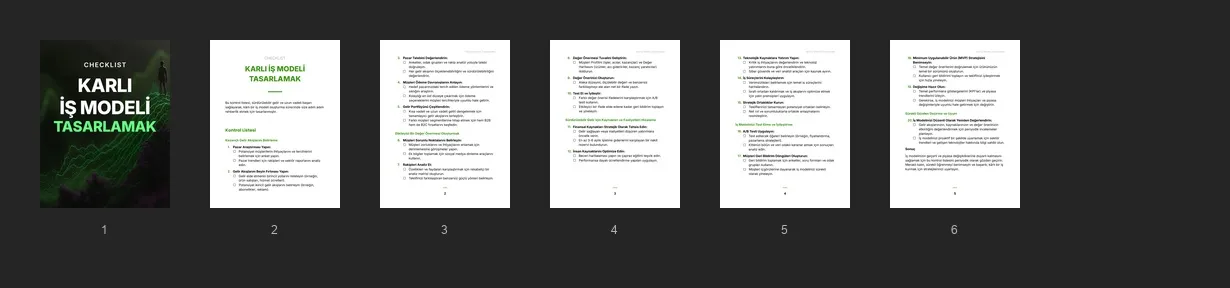 İşletmelerin karlı bir iş modeli oluşturmalarına adım adım rehberlik etmek için tasarlanmış, gelir akışlarını, değer önerilerini, kaynak tahsisini ve uzun vadeli sürdürülebilirliği kapsayan kontrol listesi.