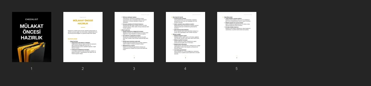 Müşterilerinizin görüşmelere hazırlanmasında rehberlik edecek, temel belgeleri, şirket araştırmasını, role özgü hazırlığı ve görüşme lojistiğini kapsayan kontrol listesi.