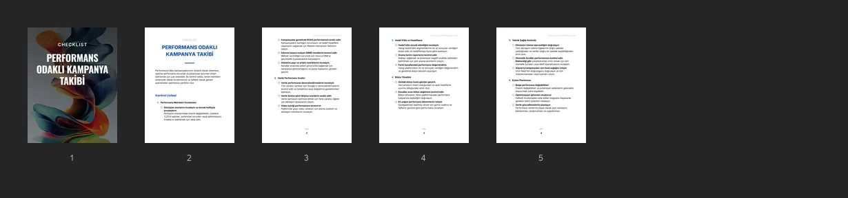 Müşterilerinizin Google Performance Max kampanyalarını izlemelerine yardımcı olmak için adım adım temel metrikleri, varlık performansını ve bütçe optimizasyonunu takip eden kontrol listesi.