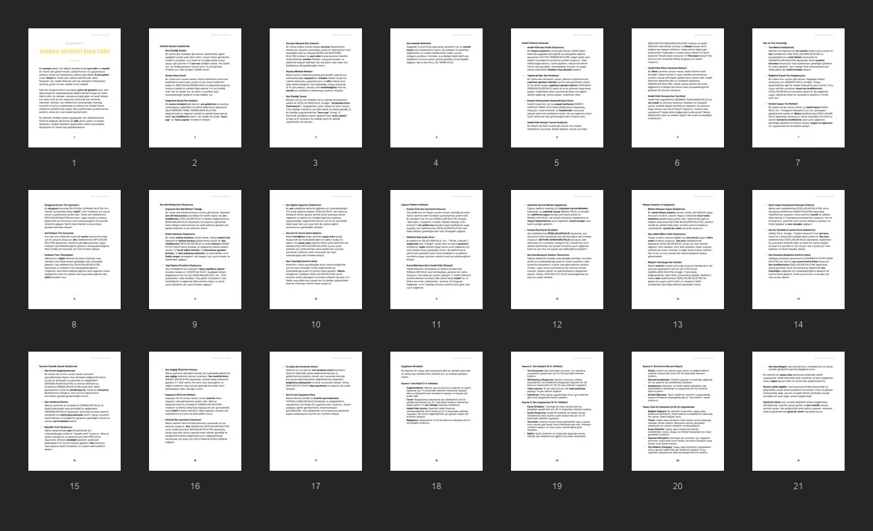 Müşterilerinizin tüm kanallarda tutarlı, net ve güvenilir kalan benzersiz bir marka sesi oluşturmak, geliştirmek ve yönetmek için yapay zekayı kullanmalarına yardımcı olmak üzere tasarlanmış istem paketi.