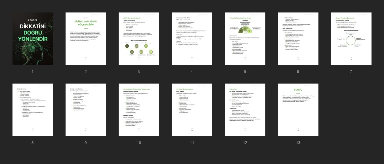 Müşterilerinizin, zaman yönetimi, alışkanlık oluşturma ve güçlü yönlerine göre uyarlanmış üretken ortamlar yaratma stratejileriyle DEHB'yi yönetmelerine yardımcı olacak kılavuz.