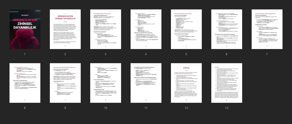 Müşterilerinizin stresle başa çıkma, dayanıklılık geliştirme ve iş zorlukları sırasında odaklanmayı sürdürme stratejileriyle zihinsel dayanıklılıklarını artırmalarına yardımcı olmak için tasarlanmış kılavuz.