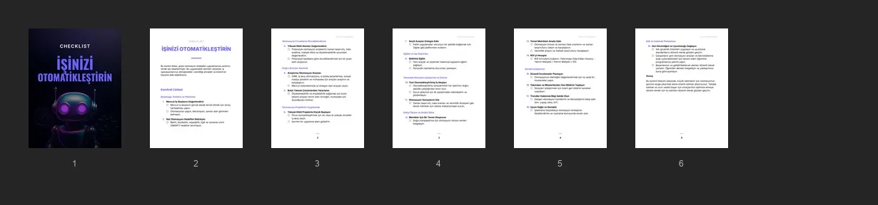 Müşterilerinizin e-posta pazarlaması, sosyal medya yönetimi, müşteri desteği ve muhasebe gibi temel görevleri otomatikleştirme sürecinde işletmeleri yönlendirmelerine yardımcı olacak net adımları keşfedin. Bu kontrol listesi, otomasyon fırsatlarını belirlemek, doğru araçları seçmek ve başarılı otomasyon projeleri uygulamak için ihtiyaç duydukları tüm araçları sağlar.