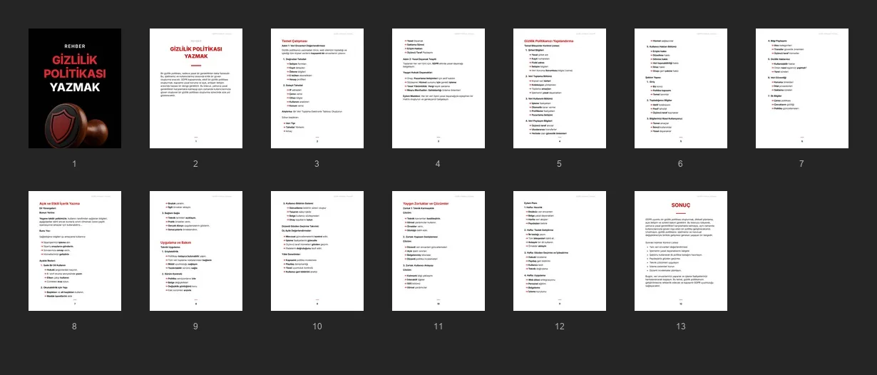 Müşterilerinizin, veri işleme, yasal gereklilikler ve kullanıcı iletişimi için kolay adımları kullanarak net ve güvenilir bir GDPR uyumlu gizlilik politikası yazmalarına yardımcı olacak kılavuz.